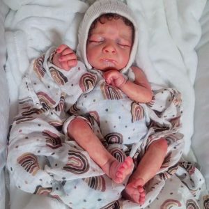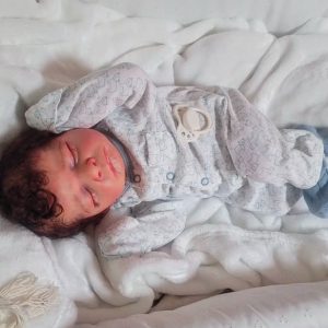 High end and gorgeous with yearling curly hand rooted dark brown mohair. Eyelashes also rooted. Mottling..veining. capillaries etc. This baby’s photos don’t do justice! Baby is stuffed with high quality glass beads and poly silk. Baby has magnetic pacifier and magnetic bow for easy gender swaps. Baby comes as seen but you can just as easily dress as a girl for your preferred gender !
