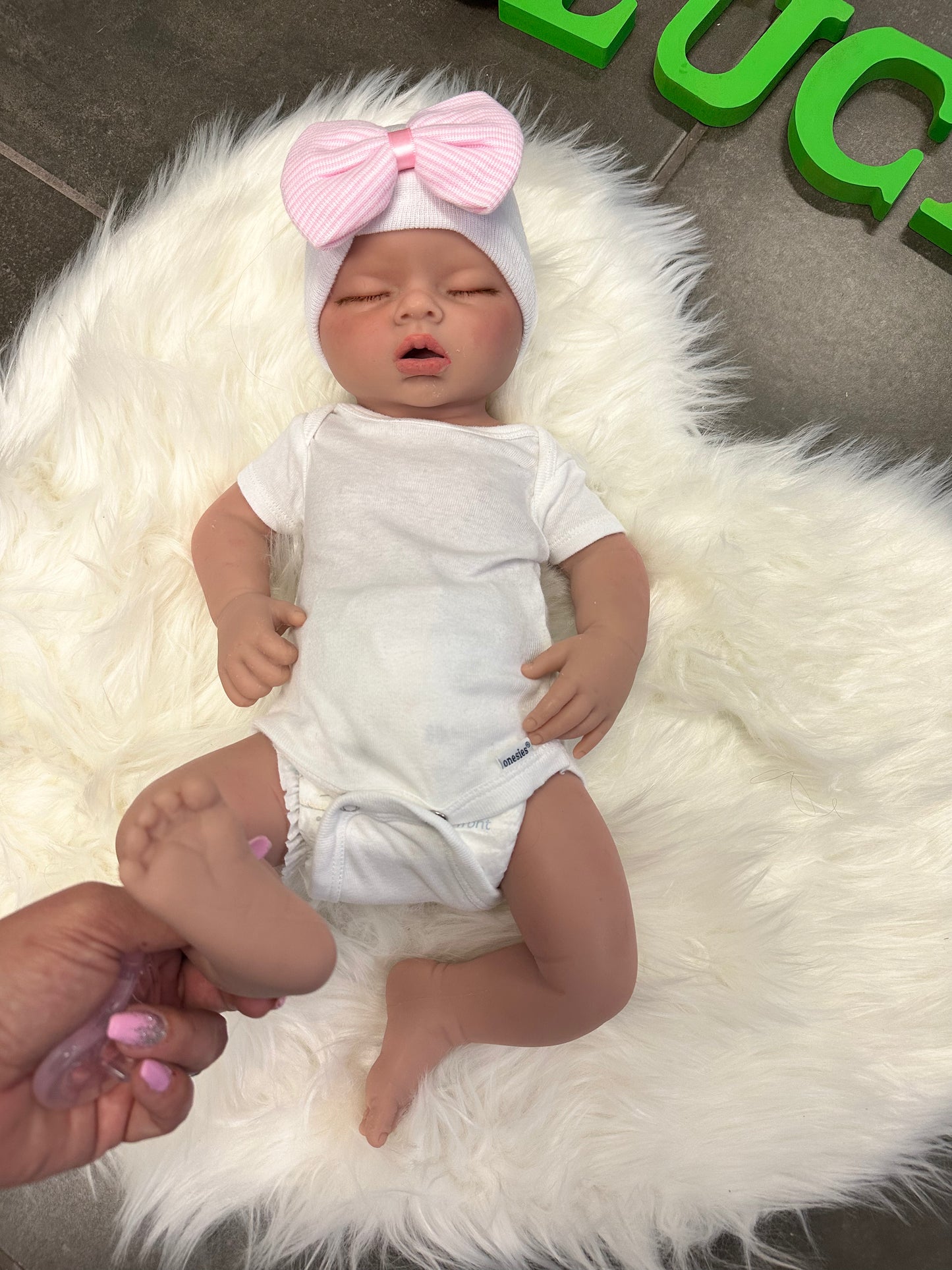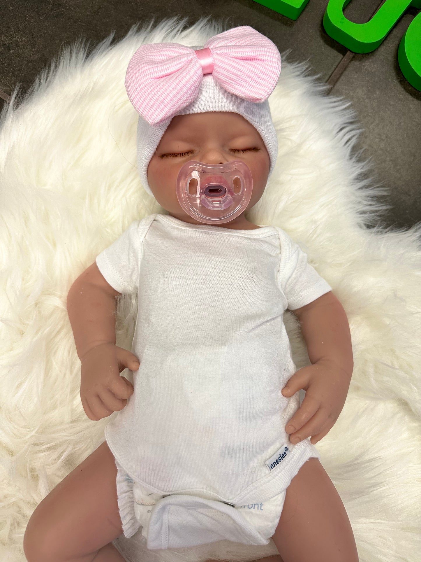 Her mouth was opened to take pacifiers, the body has small seams on arms and head from the silicone mold.  This is normal and also not very noticeable. This baby comes with hospital blanket, white onesie, hospital hat, and birth certificate.