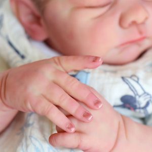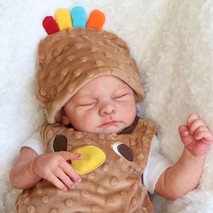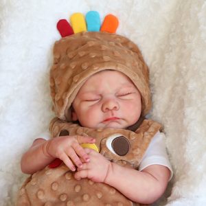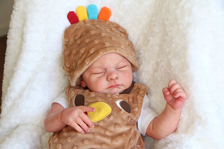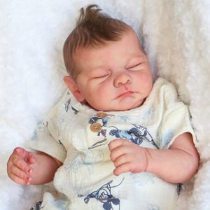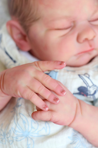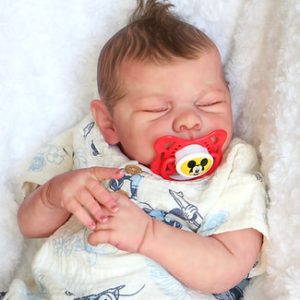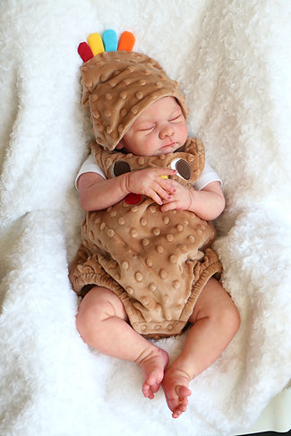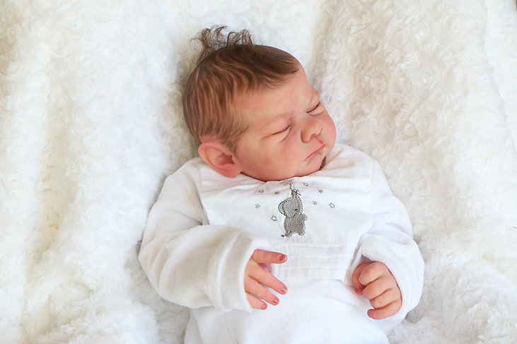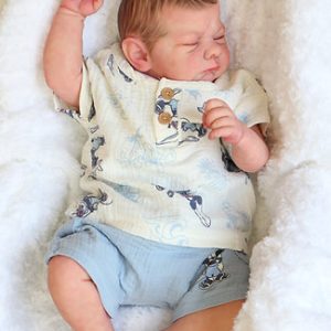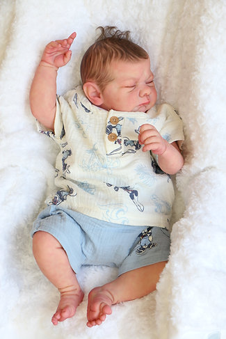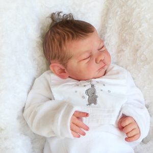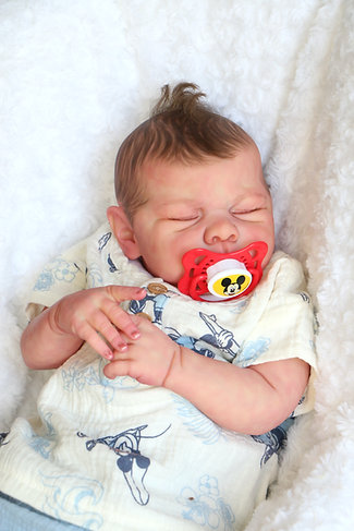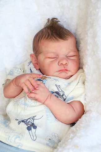 is truly as amazing as he is. He’s fooled everyone he’s met, playing cute little jokes on them to make them think he’s a real baby. He loves to show off, even though he sleeps all the time! He’s 21′ long with full length legs and arms and a cloth doe-suede body. He is weighted with tiny glass beads and polyfil to 7 pounds 3.4 ounces and is painted with heat-set paints and varnish. He has a magnet inside his head to support a magnetic pacifier (which can be removed upon request). His hair is amazingly soft Suri Alpaca from Poland. He wears newborn clothes nicely and looks wonderful in everything he wears. He has lightly mottled skin and is fair in color. He is a Limited Edition #9 of 2000. He is posed as a boy, but he can easily be either boy or girl gender.
