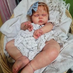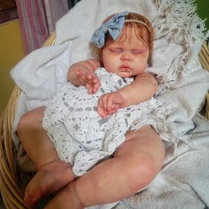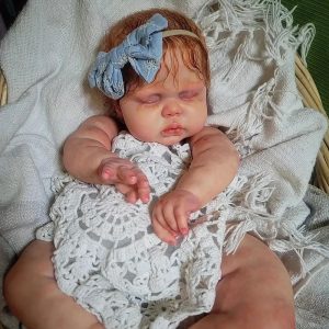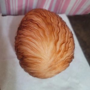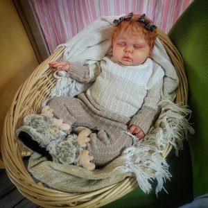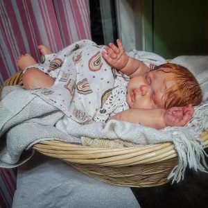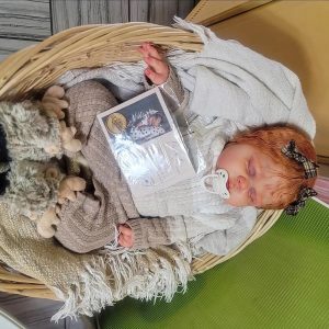 Pickle is absolutley breathtaking as a red head and not many artists work with red hair. Mine has stunning curly yearling mohair hand rooted. Care guide included! Baby has magnetic pacifier. It sits on the lips a bit off but it’s because he has huge lips. A honeybug pacifier will fix this! I have NONE on hand so I’m including the white one seen in pics. Baby has magnet in hand to hold his (or her) own paci. There are also 2 magnets in her head for bows. Magnets detach so you can easily change bows to your liking. Baby is HUGE and weighs 12 1/2lbs and 25″ long. Glass beads and poly. Baby wears 6mo outfits and can go up to 12! Big!